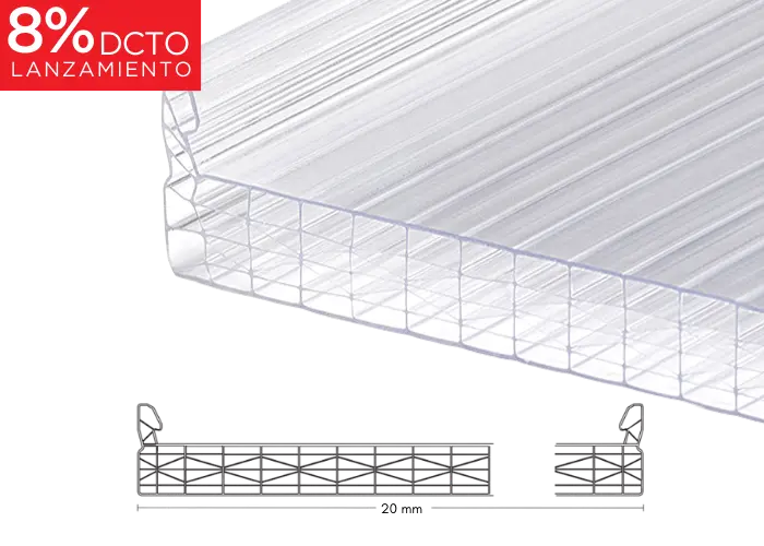 Sistema alveolar multipared, con conectores de sello seco 100% hermético. Con protección UV en ambas caras de las láminas, otorgando alto aislamiento térmico, control de luz y rigidez. Promoción de lanzamiento sujeta a términos y condiciones.