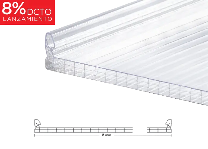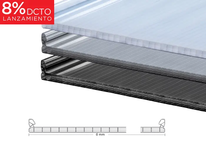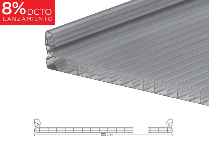 Sistema alveolar multipared, con conectores de sello seco 100% hermético. Con protección UV en ambas caras de las láminas, otorgando alto aislamiento térmico, control de luz y rigidez.