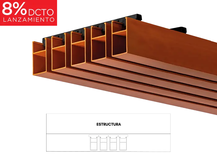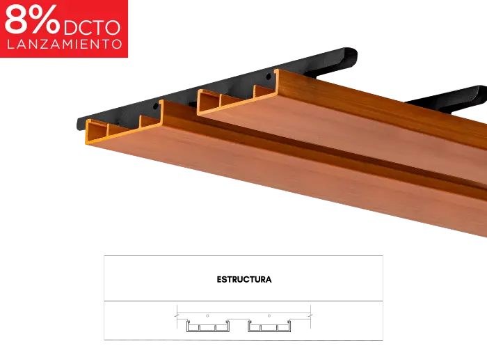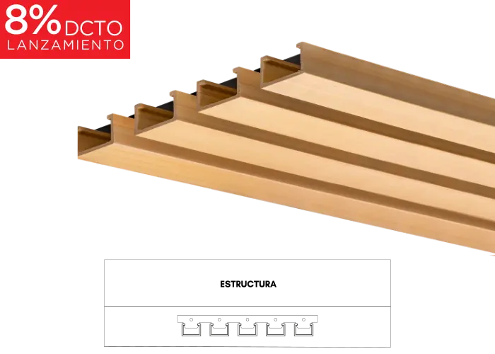Listones en WPC aligerado, versátiles e ideales para cielorrasos y/o revestimientos interiores. Gracias a su sistema de fijación tipo click, son fáciles de instalar y brindan a los espacios una apariencia natural, gracias a su acabado similar a la madera.