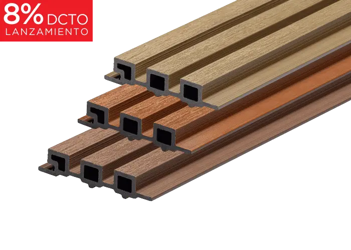 Wallpanel EXT 168-26 es un revestimiento fabricado en ASA (Acrilonitrilo Estireno Acrilato), diseñado para aplicaciones en fachadas, cielos rasos y revestimientos exteriores e interiores. Su diseño con 4 pastillas y su acabado en tono Teka brindan una estética cálida y natural con una resistencia excepcional a la intemperie, la humedad y los rayos UV.